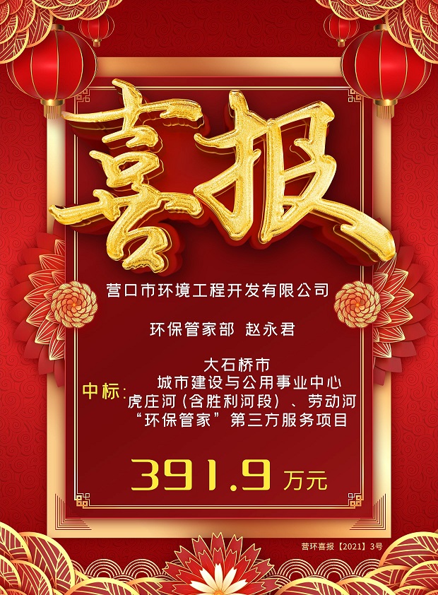 營口市環(huán)境工程開發(fā)有限公司中標大石橋市城市建設與公用事業(yè)中心虎莊河(含勝利河段)、勞動河“環(huán)保管家”第三方服務項目