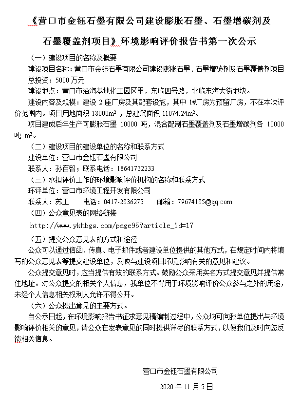 《營口市金鈺石墨有限公司建設(shè)膨脹石墨、石墨增碳劑及 石墨覆蓋劑項(xiàng)目》環(huán)境影響評(píng)價(jià)報(bào)告書第一次公示