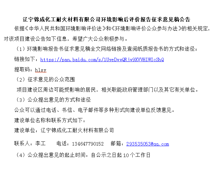 遼寧錦成化工耐火材料有限公司環(huán)境影響后評(píng)價(jià)報(bào)告征求意見稿公告