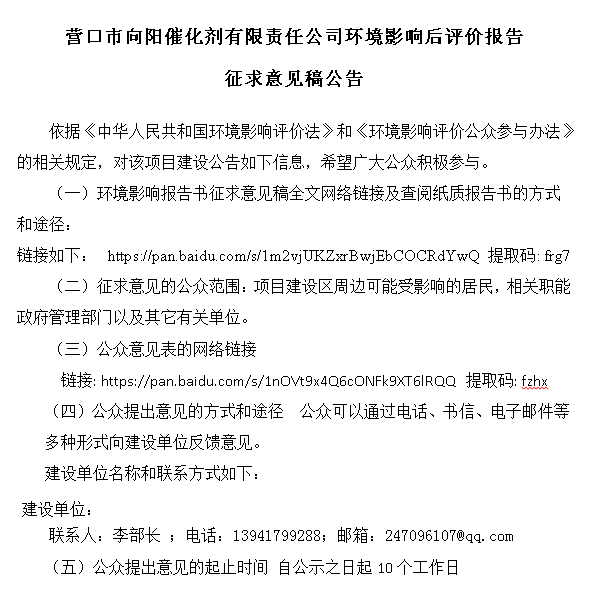 營口市向陽催化劑有限責任公司環(huán)境影響后評價報告 征求意見稿公告